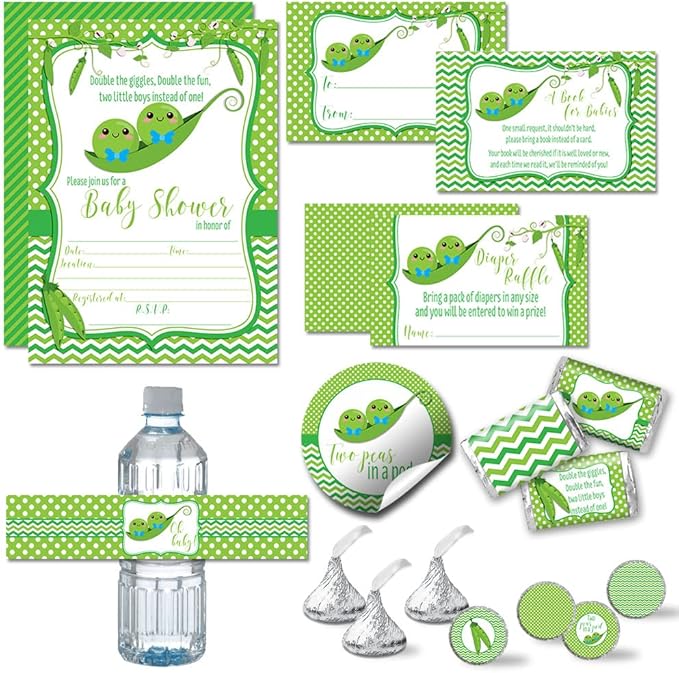 Two Peas in a Pod Baby Shower Party Bundle Includes 20 Invitations with Envelopes , 4 Different Sizes of Decorative Stickers, Diaper Tickets & Bring a Book Cards